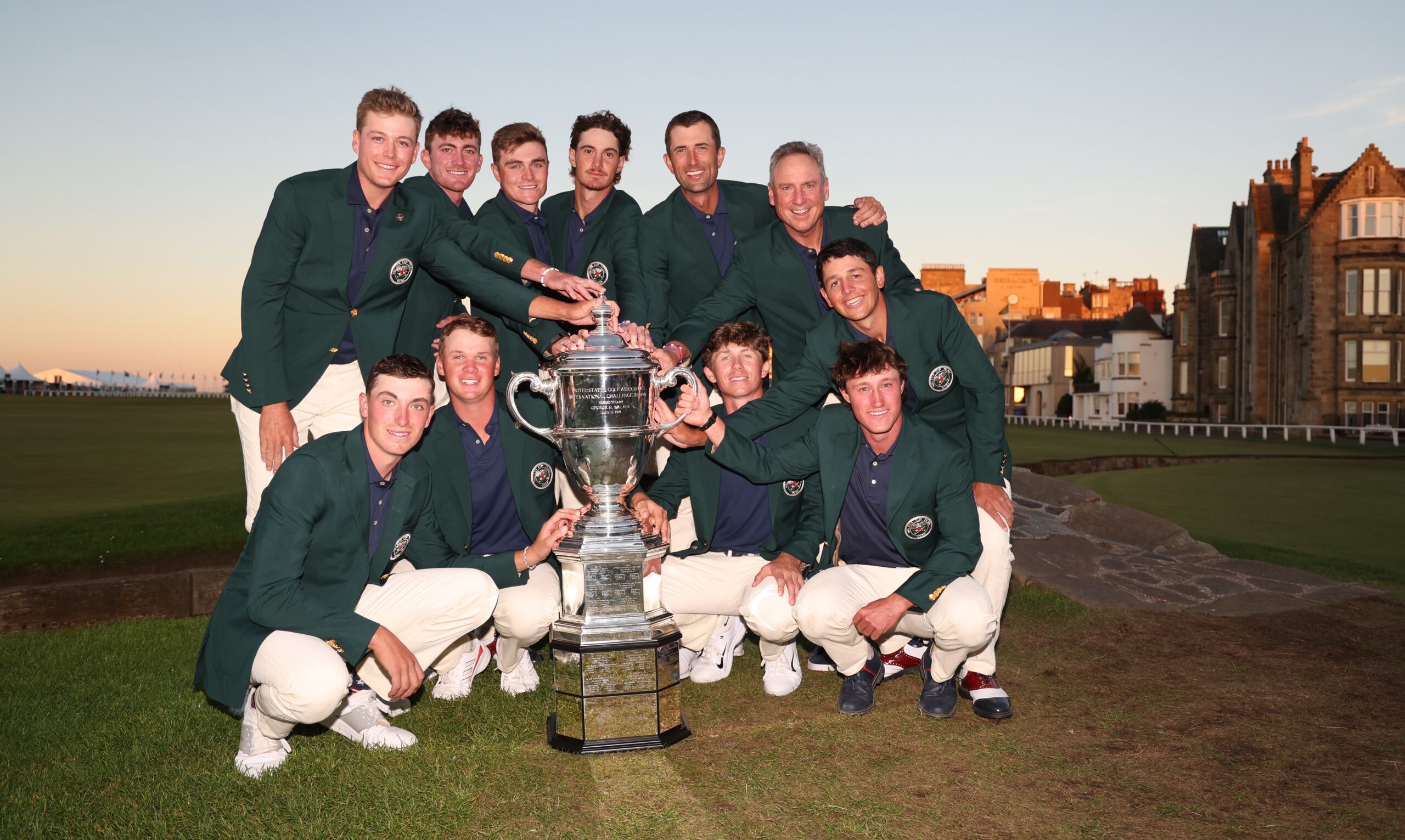 ST ANDREWS, SCOTLAND – SEPTEMBER 03: The USA Team pose with the Walker Cup on the Swilcan Bridge after their victory in The Walker Cup at St Andrews Old Course on September 03, 2023 in St Andrews, Scotland. (Photo by Oisin Keniry/R&A/R&A via Getty Images)
