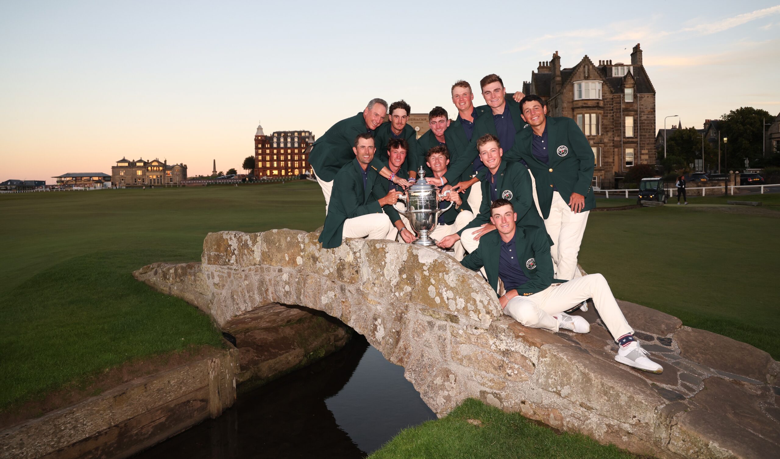 ST ANDREWS, SCOTLAND – SEPTEMBER 03: The USA Team pose with the Walker Cup on the Swilcan Bridge after their victory in The Walker Cup at St Andrews Old Course on September 03, 2023 in St Andrews, Scotland. (Photo by Oisin Keniry/R&A/R&A via Getty Images)