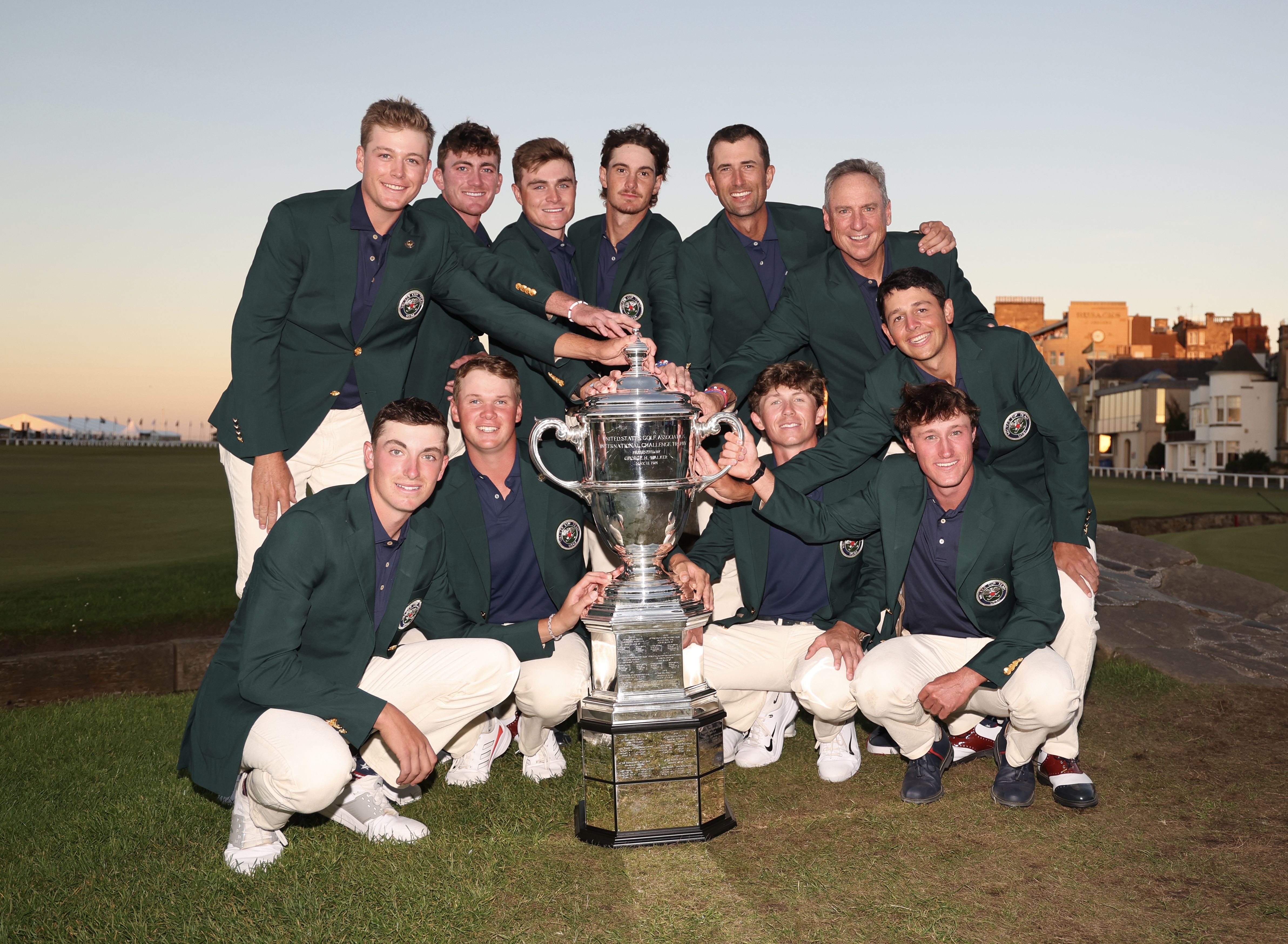 ST ANDREWS, SCOTLAND – SEPTEMBER 03: The USA Team pose with the Walker Cup on the Swilcan Bridge after their victory in The Walker Cup at St Andrews Old Course on September 03, 2023 in St Andrews, Scotland. (Photo by Oisin Keniry/R&A/R&A via Getty Images)